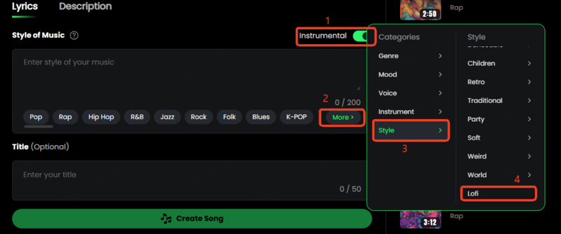 Step 3. Choose Style → Lofi, or type your own style keywords.